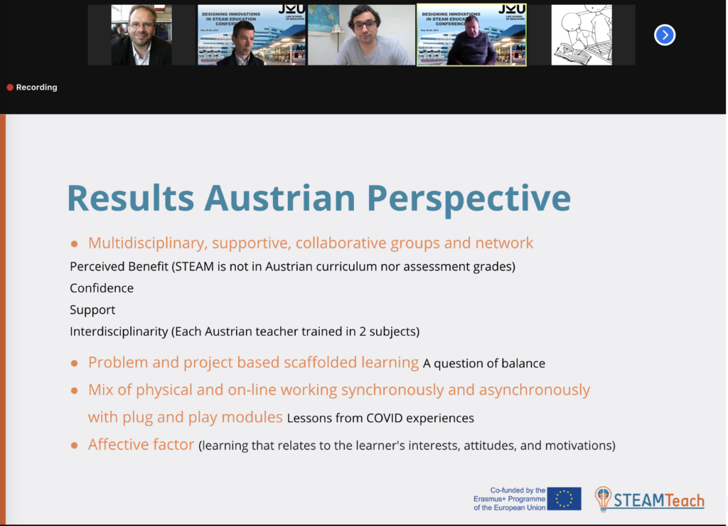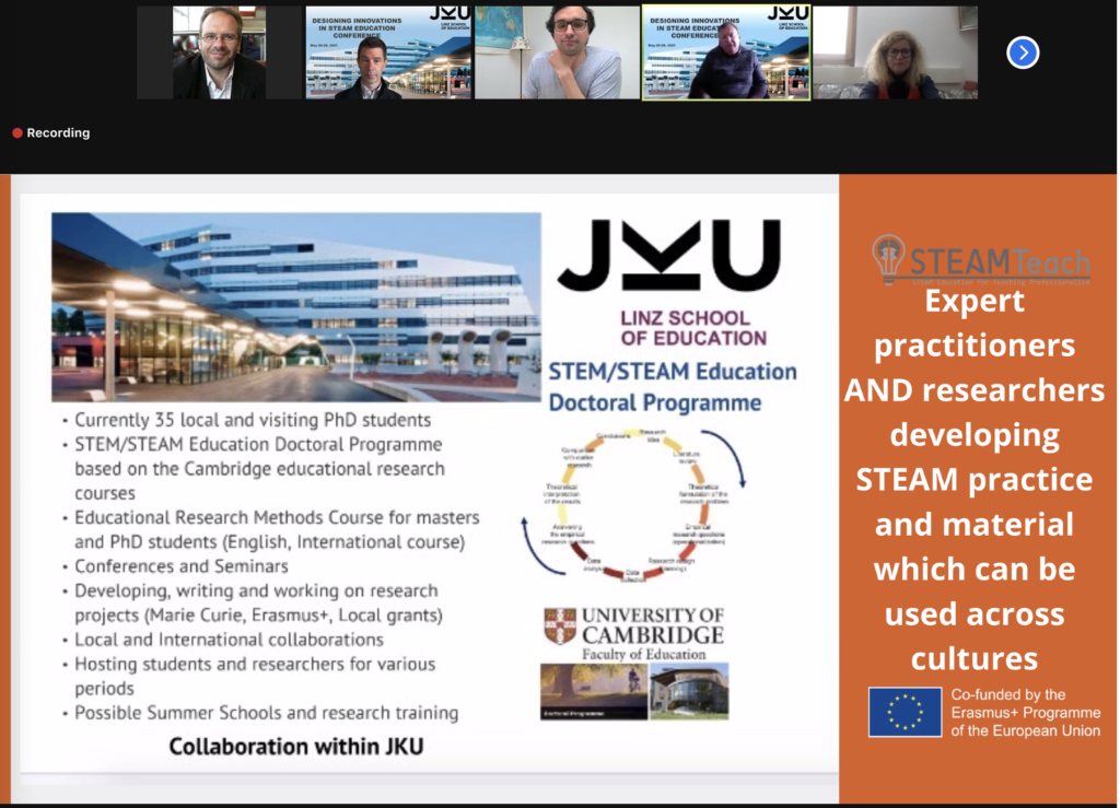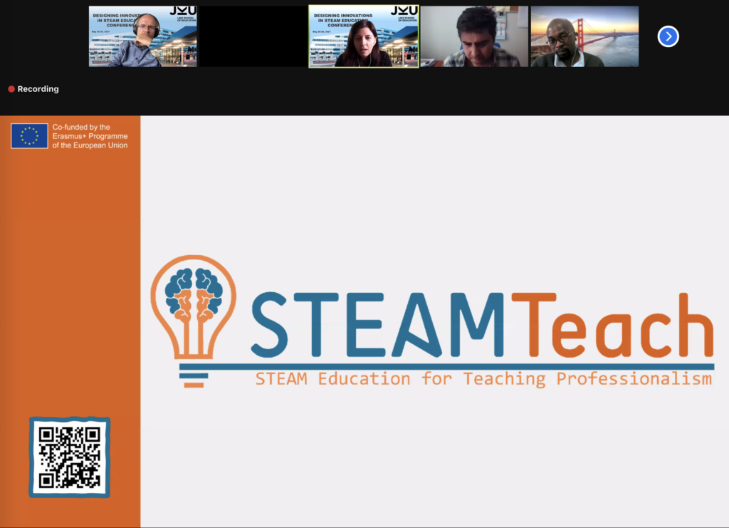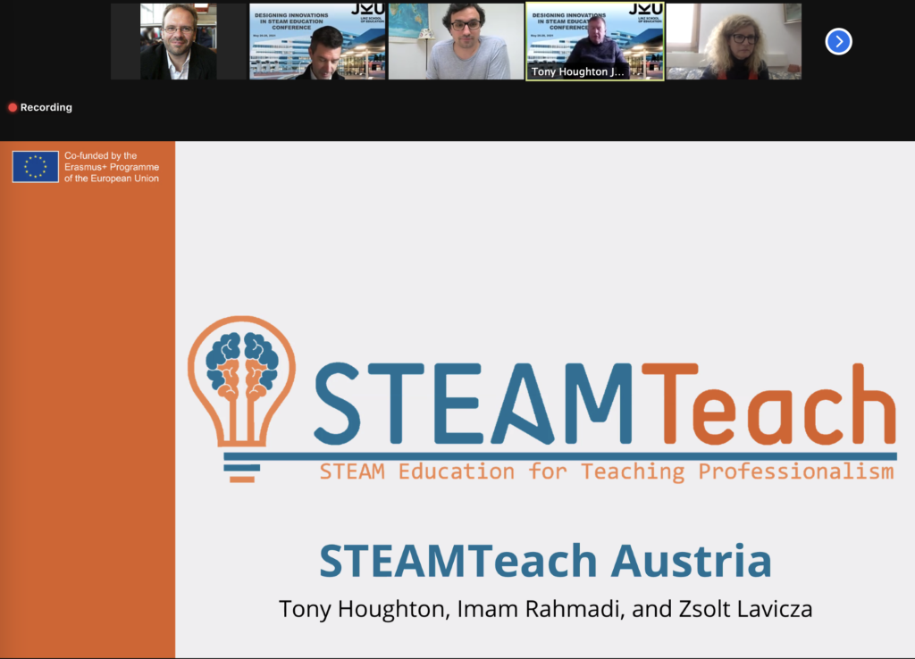 Members of the Spanish (J. M. Diego-Mantecón) and Austrian (T. Houghton, I. Rahmadi and Z. Lavicza) teams presented STEAMTeach results at the Designing Innovations in STEAM Education Conference organised by the Johannes Kepler University Linz. Diego-Mantecón gave a presentation entitled ‘The importance of teachers’ specialization when implementing STEM projects’ on May 27, 2021. Houghton, Rahmadi and Lavicza presented ‘STEAMTEACH Austria: Towards a STEAM professional development programme’ during STEAM Austria Day on May 29, 2021. Designing Innovations in STEAM Education Conference was held virtually in Linz, Austria.