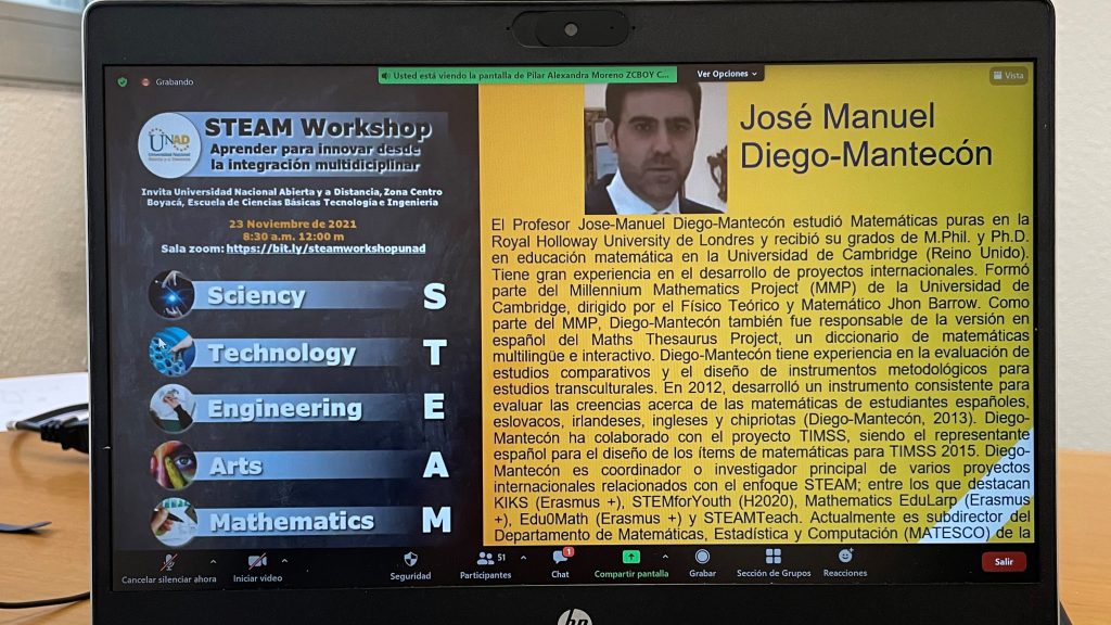 Dr. Diego-Mantecón, from the UC team, participated in the STEAM workshop ‘Aprender para innovar desde la integración multidisciplinar’ (Learn to innovate from multidisciplinary integration), with the talk Experiencias signitivas: Comunidad KIKS (Significant Experiences: KIKS community‘). The event was held virtually on 23rd November 2021, and organised by the Universidad Nacional Abierta y a Distancia. Participants were mainly university teachers and deans from Colombia. More than 50 participants were attending Diego-Mantecón’s session.